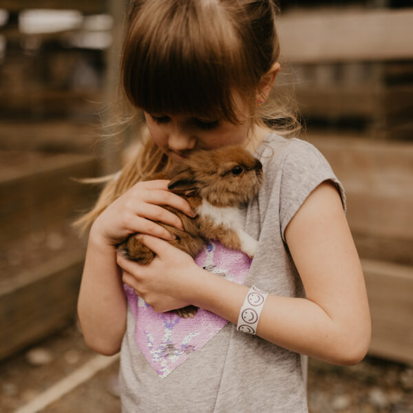 Visual Description: A child gently holds a small brown rabbit close while standing outdoors near wooden fencing.