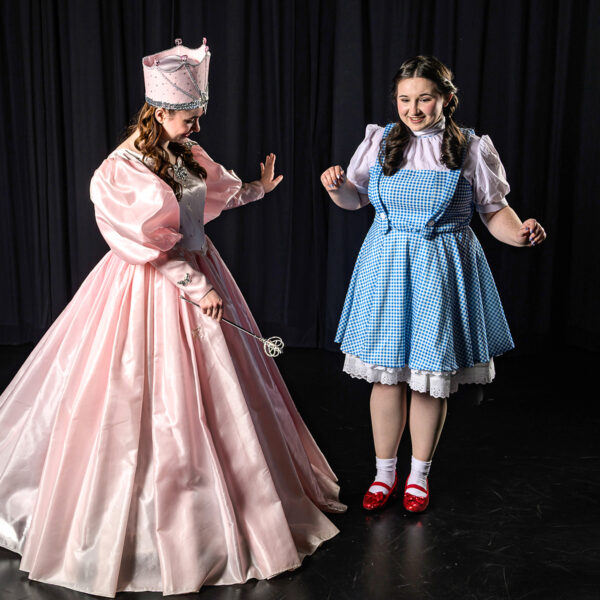 Visual Description: Two performers stand on a dark stage wearing theatrical costumes, one in a pink gown with a wand and the other in a blue gingham dress with red shoes.
