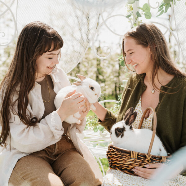 Photo Description: Robyn Bessenger / Visual Description: Two people sit in a garden setting holding white rabbits, with one rabbit resting in a wicker basket.