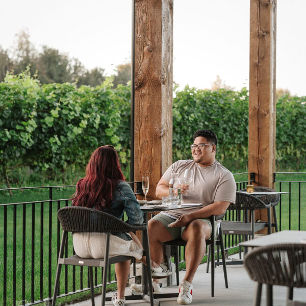 Photo Description: Robyn Bessenger / Visual Description: Two people sit at an outdoor patio table under a covered structure, enjoying drinks while overlooking a green vineyard landscape.