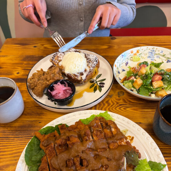 Visual Description: A plated breakfast spread sits on a wooden table, featuring waffles topped with whipped cream and syrup, a savory dish, a side salad, and coffee as hands cut into the waffles with a fork and knife.