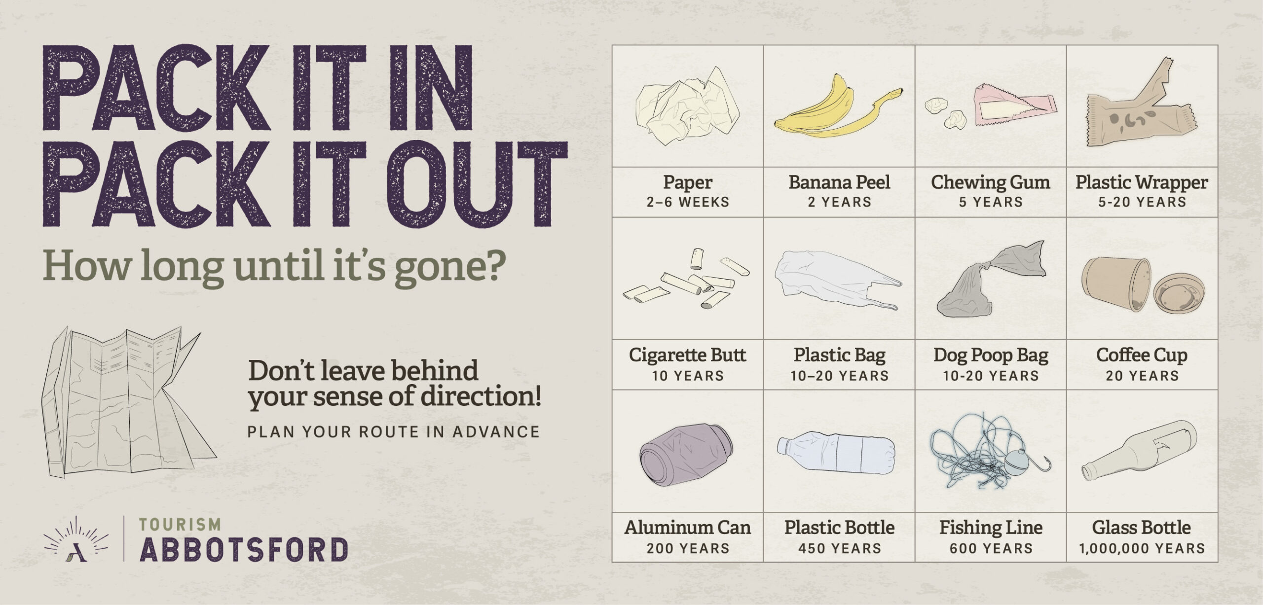 - Pack it in, pack it out! Don’t leave any garbage, food, recycling, or pet waste on the trail! Go the extra mile by picking up any litter you notice others have left!